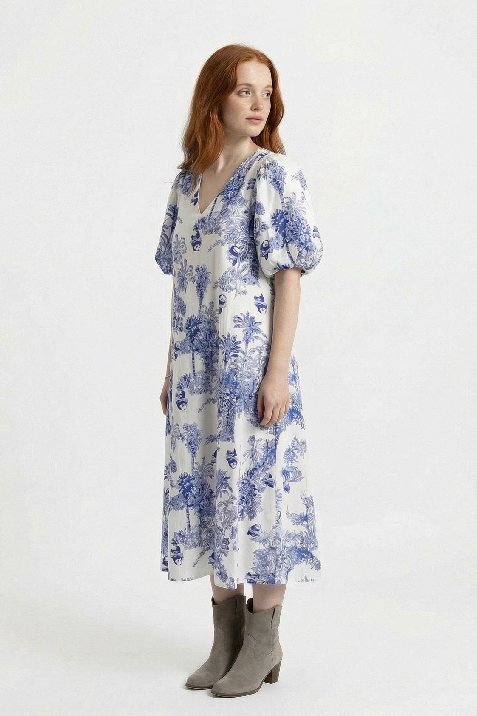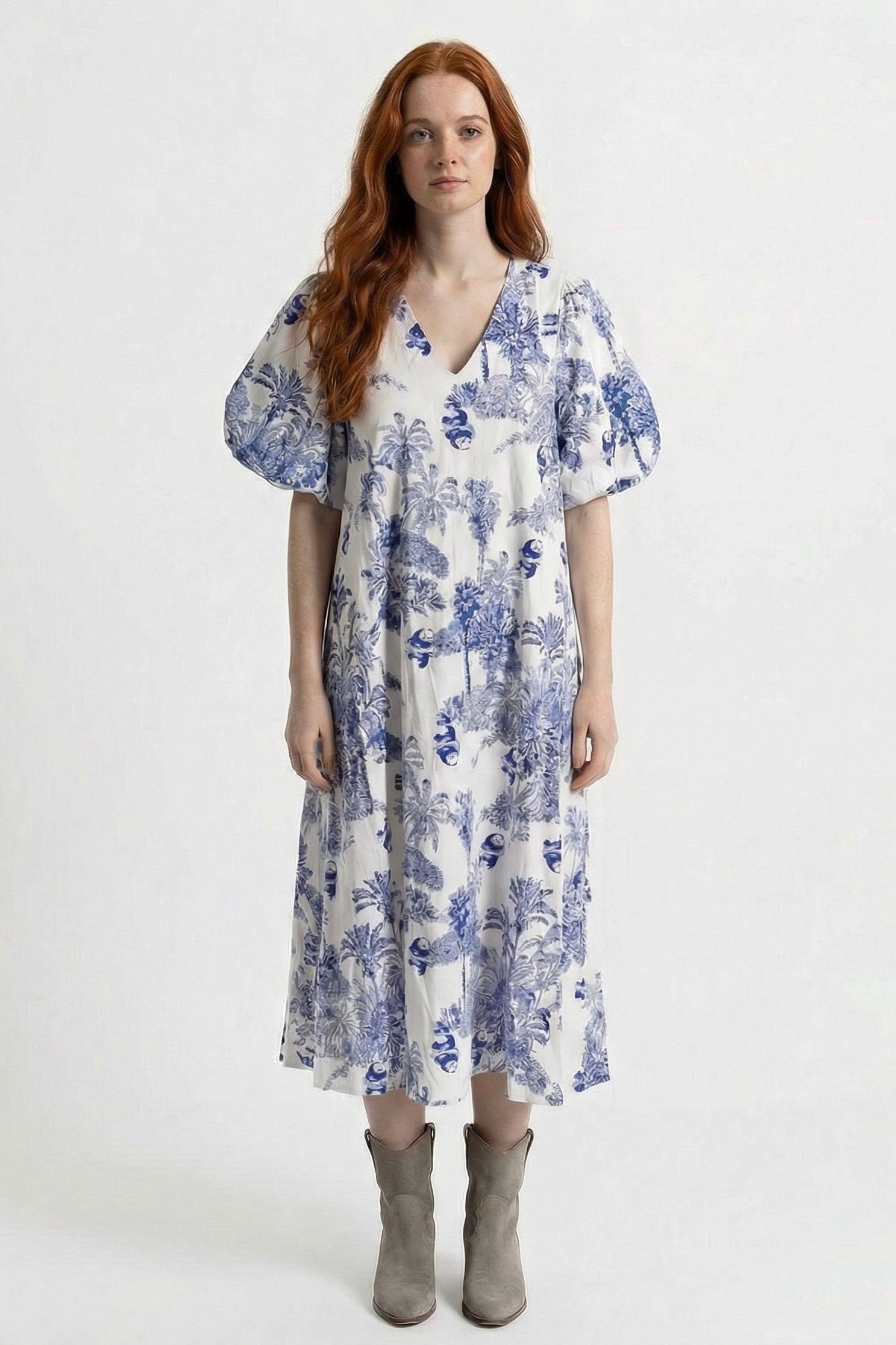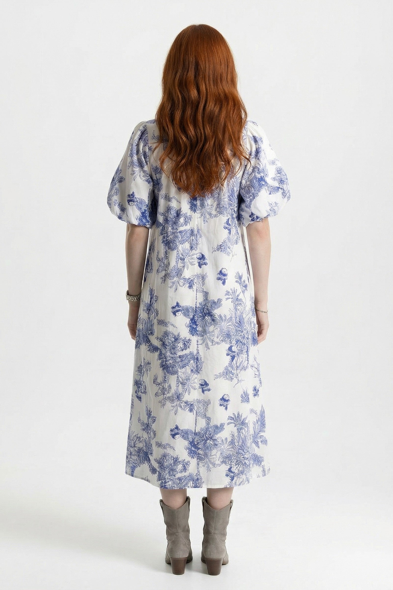 Este vestido midi, disponible en talla única (pequeña y mediana), luce una elegante combinación de colores en blanco y azul con un encantador estampado de osos panda. Sus impresionantes mangas globo y cuello en V añaden un toque de sofisticación. Fabricado en 100 % algodón, es la combinación perfecta de estilo y comodidad. La modelo mide 1,60 cm de alto.