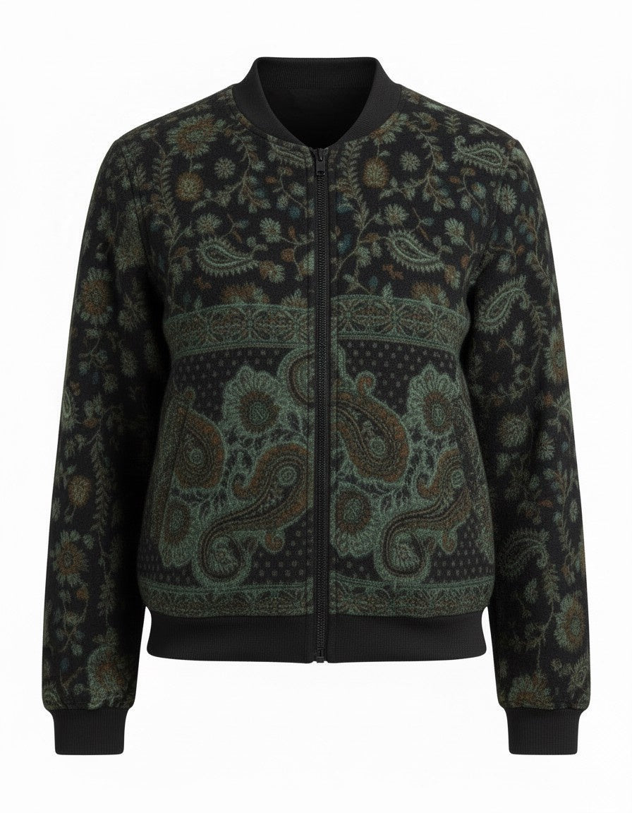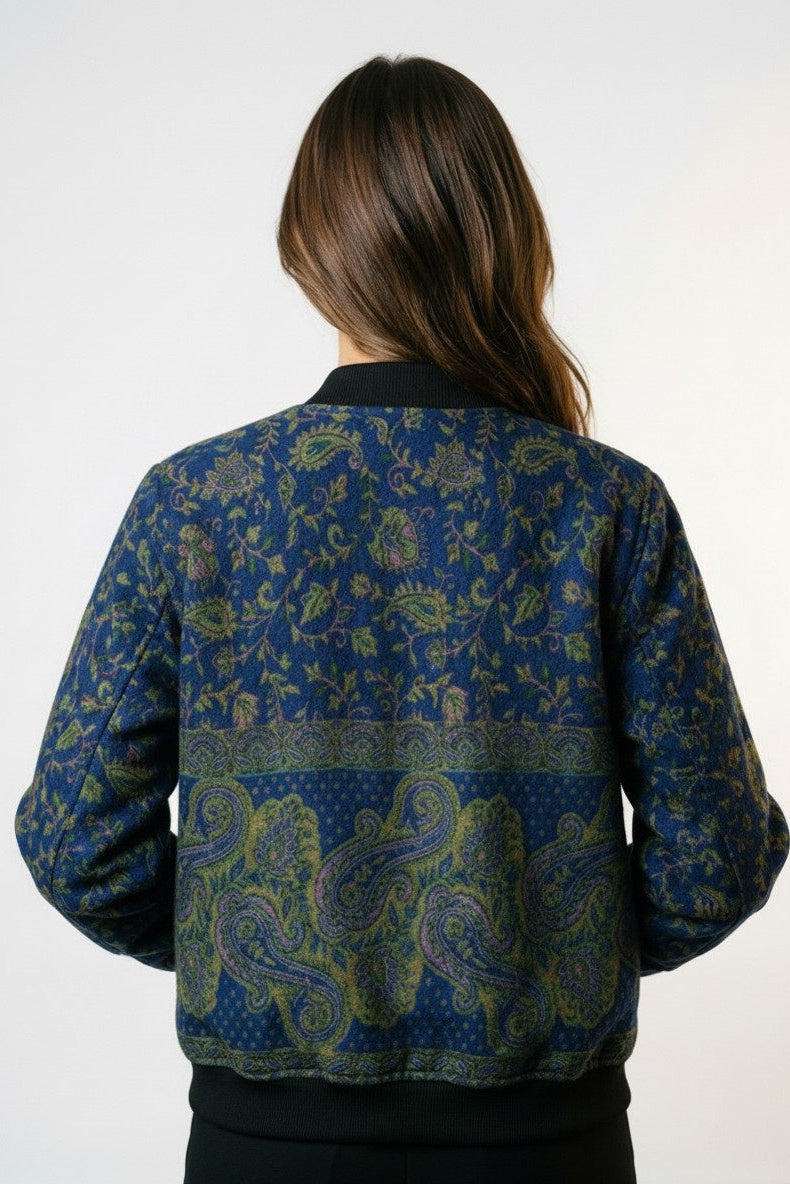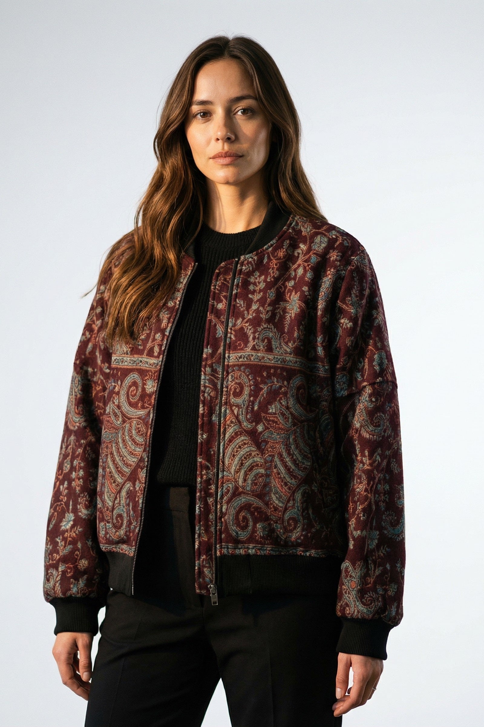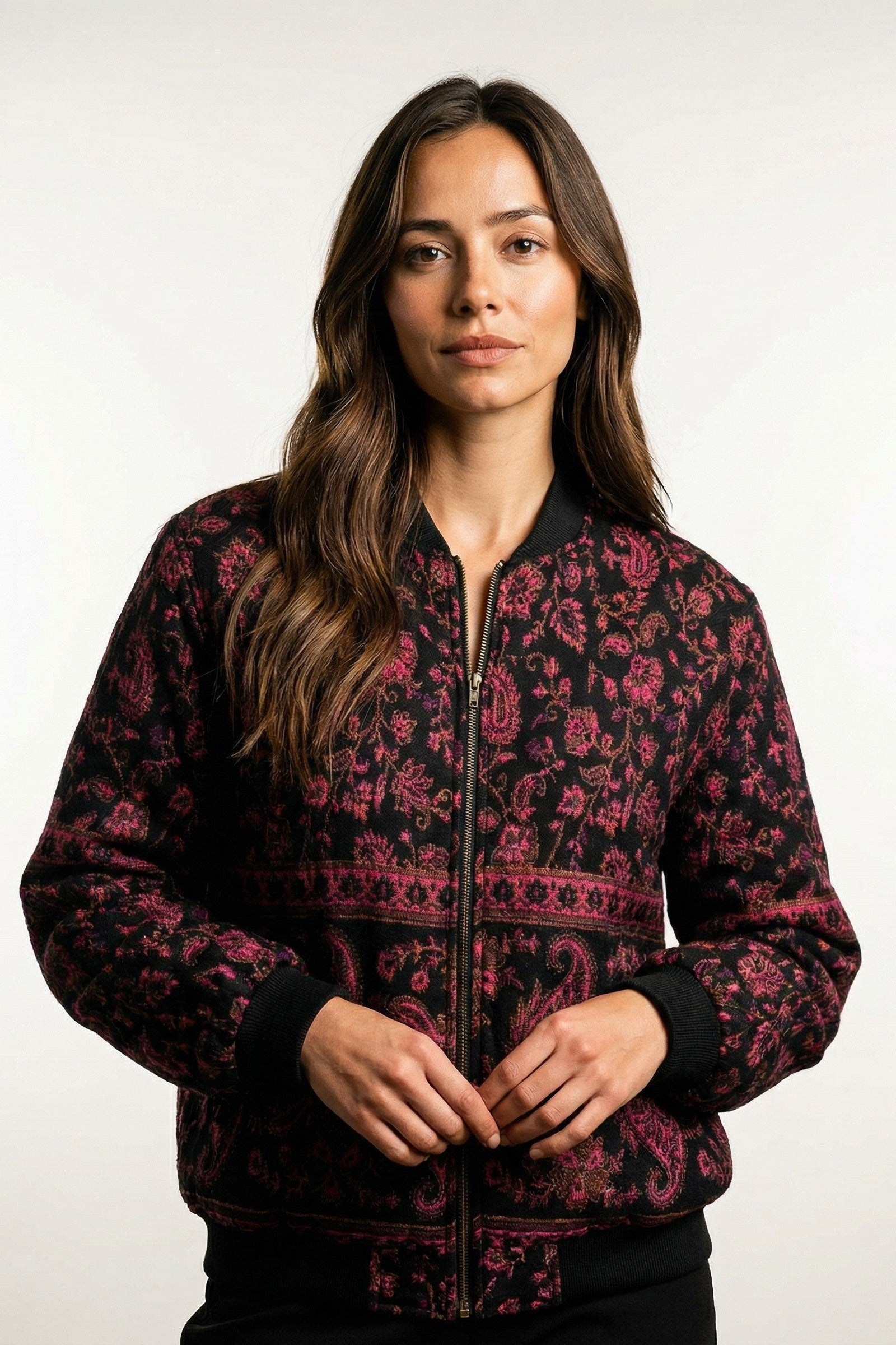Bomber unisex realizzato in tessuto esterno misto lana con motivo floreale ornamentale all-over ispirato ai tessuti tradizionali indiani. Progettato con una vestibilità leggermente ampia, comodo senza essere oversize o attillato. Stile taglia unica progettato per vestire dalla S alla L. Presenta uno scollo rotondo a coste, maniche lunghe, polsini a coste e un orlo continuo a coste nere che avvolge completamente la vita , una cerniera centrale anteriore e tasche anteriori. Rifinito con una morbida fodera in pile spazzolato nero per maggiore calore e comfort. Prodotto in India.