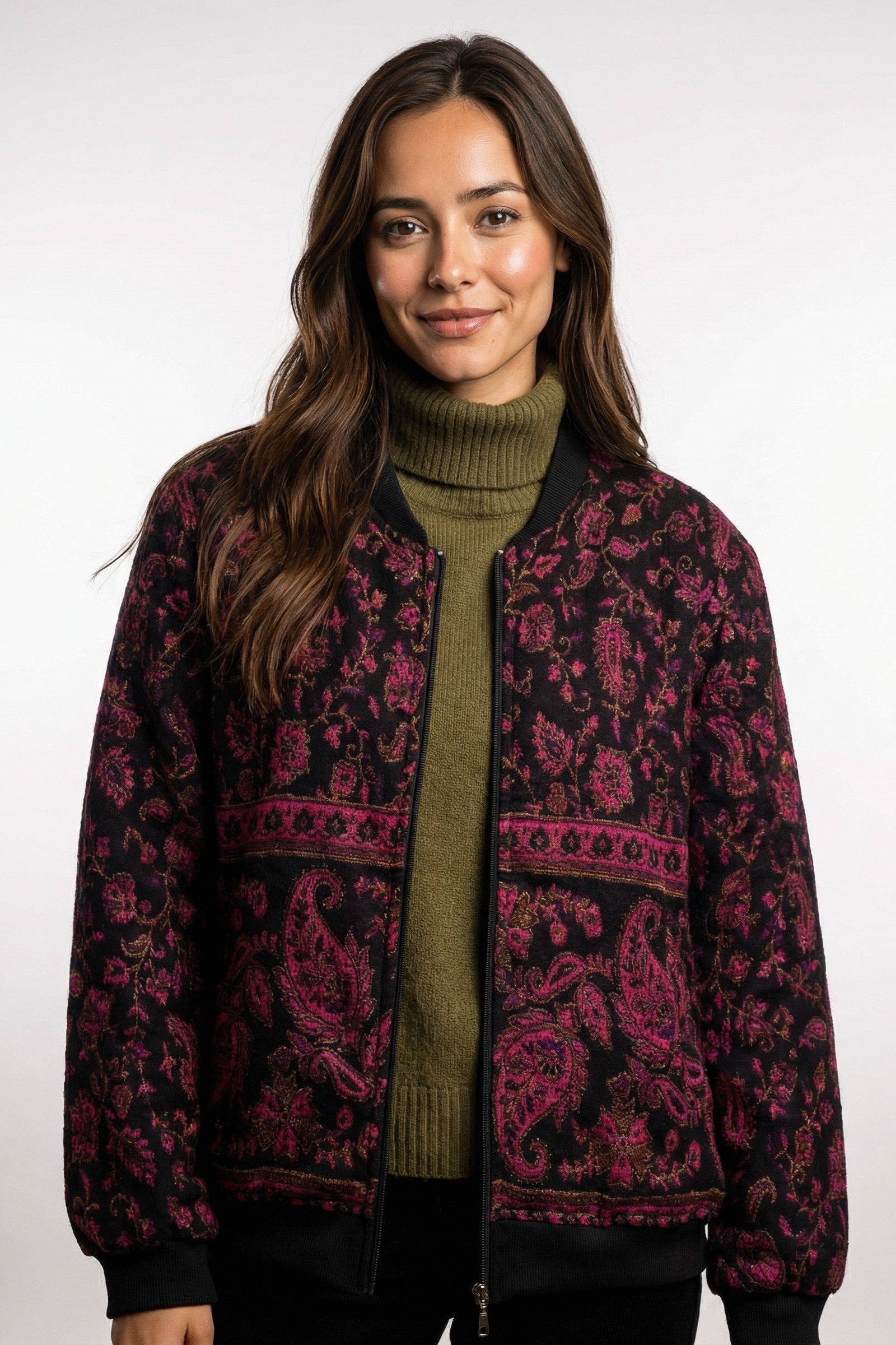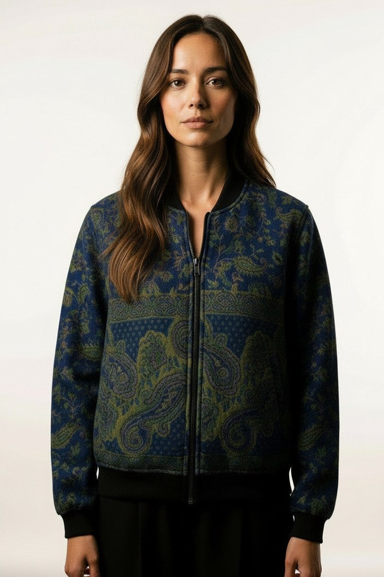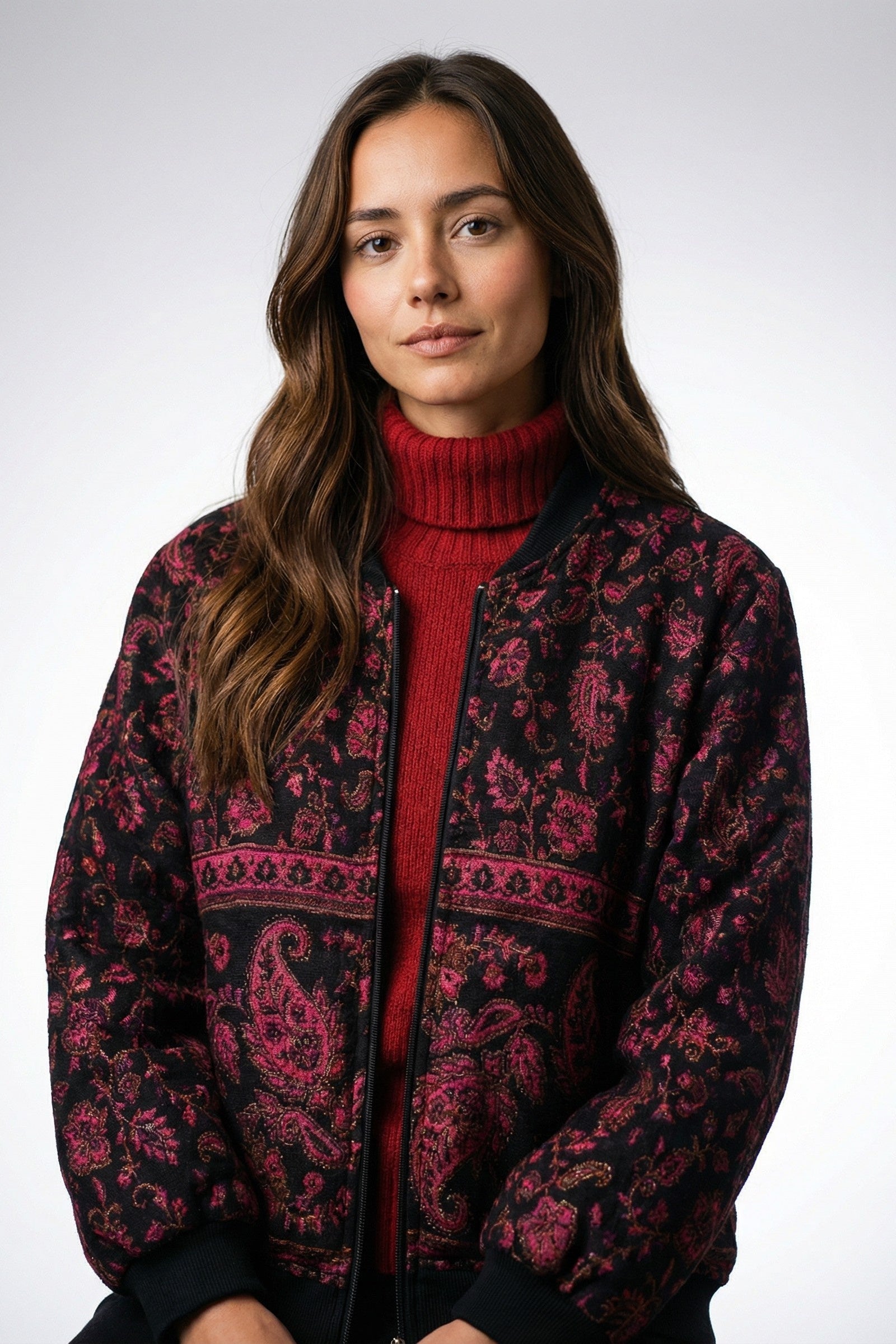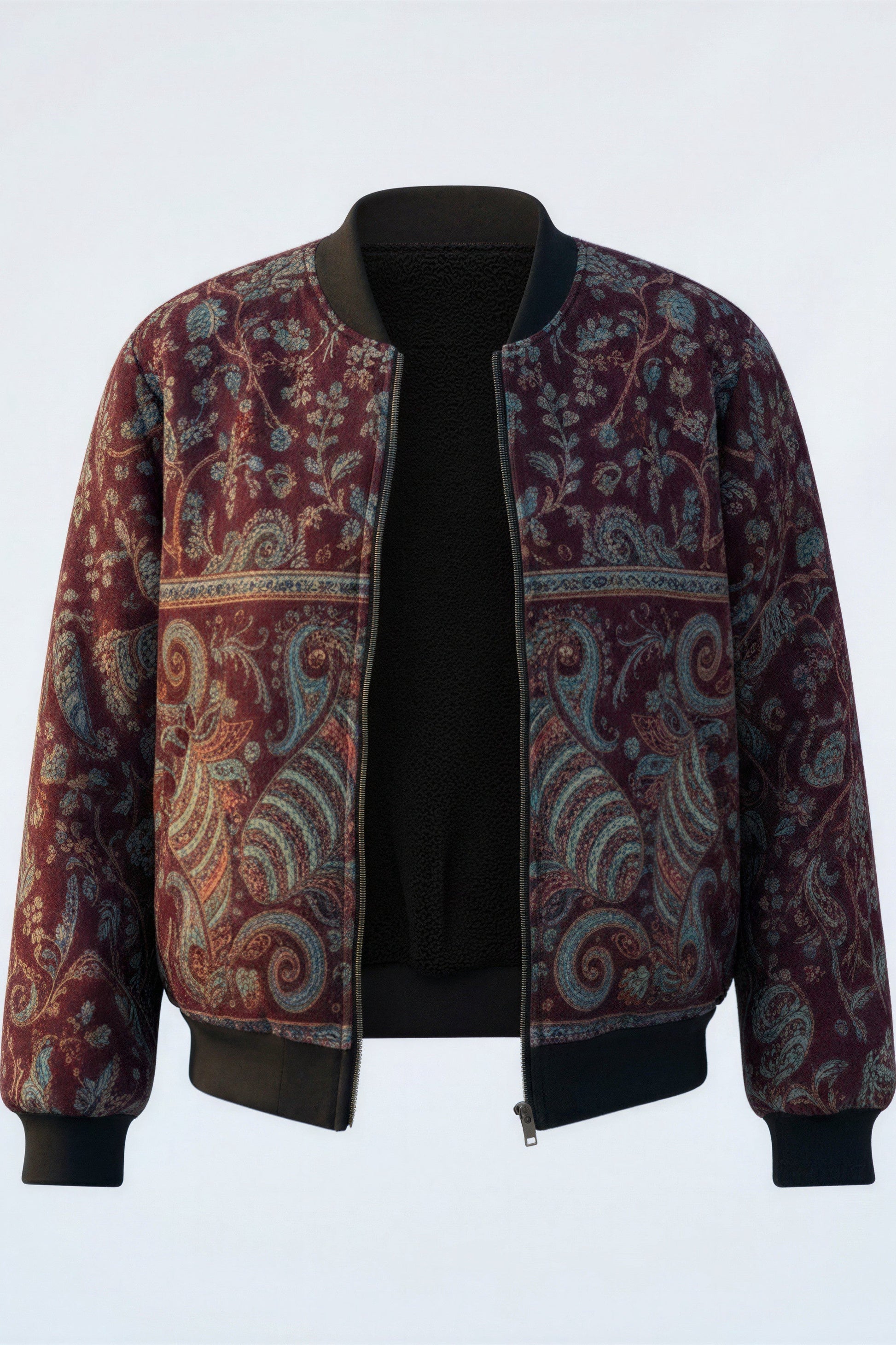 Bomber unisex realizzato in tessuto esterno misto lana con motivo floreale ornamentale all-over ispirato ai tessuti tradizionali indiani. Progettato con una vestibilità leggermente ampia, comodo senza essere oversize o attillato. Stile taglia unica progettato per vestire dalla S alla L. Presenta uno scollo rotondo a coste, maniche lunghe, polsini a coste e un orlo continuo a coste nere che avvolge completamente la vita , una cerniera centrale anteriore e tasche anteriori. Rifinito con una morbida fodera in pile spazzolato nero per maggiore calore e comfort. Prodotto in India.