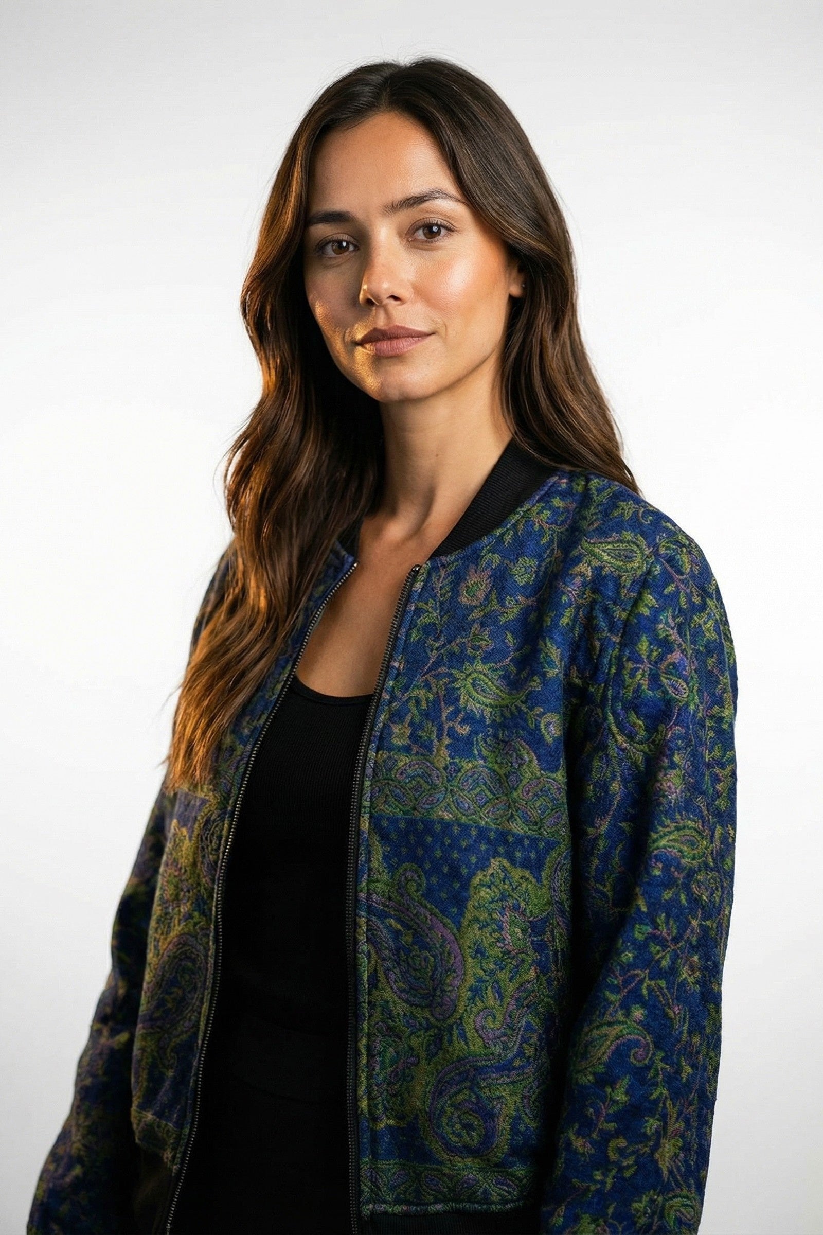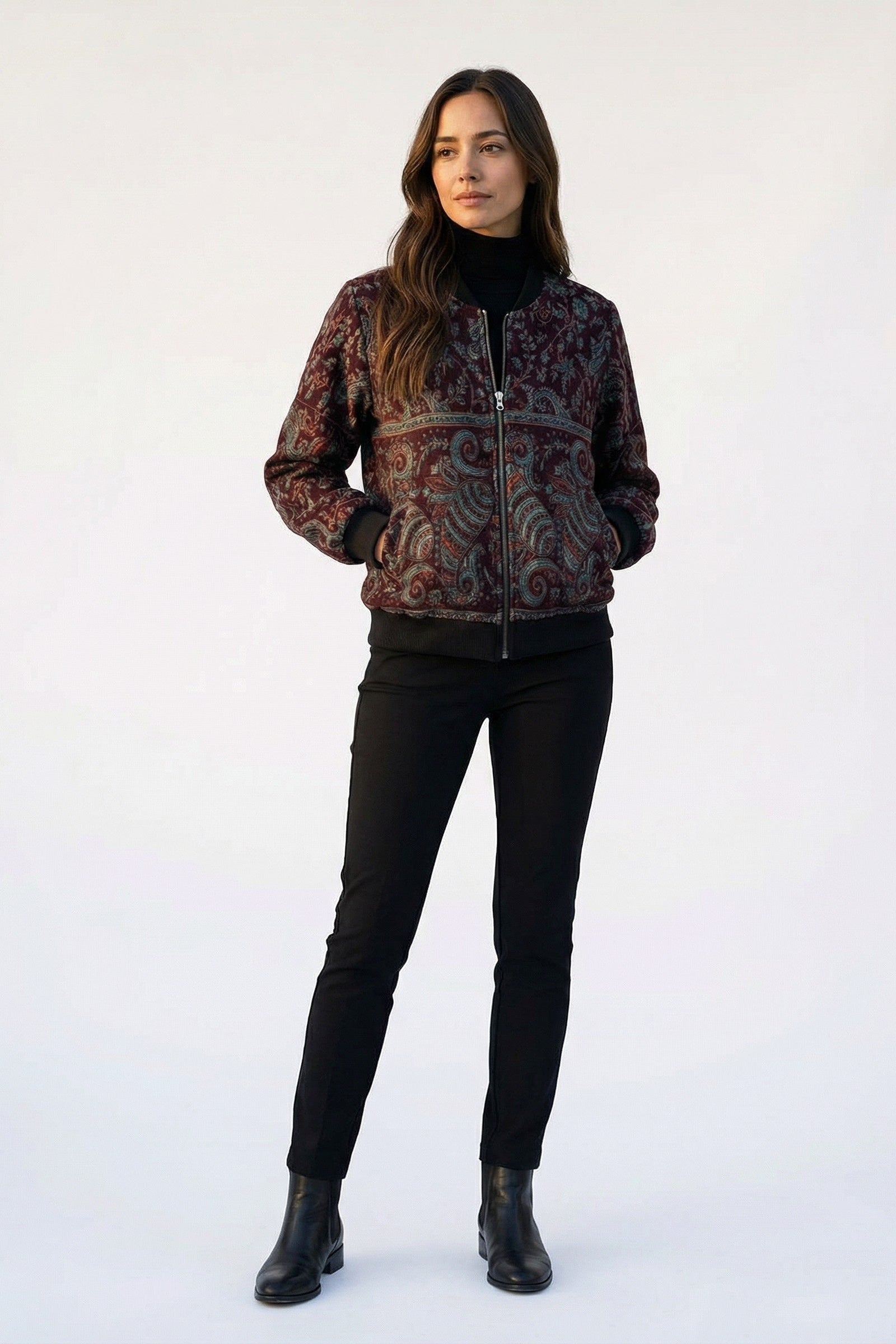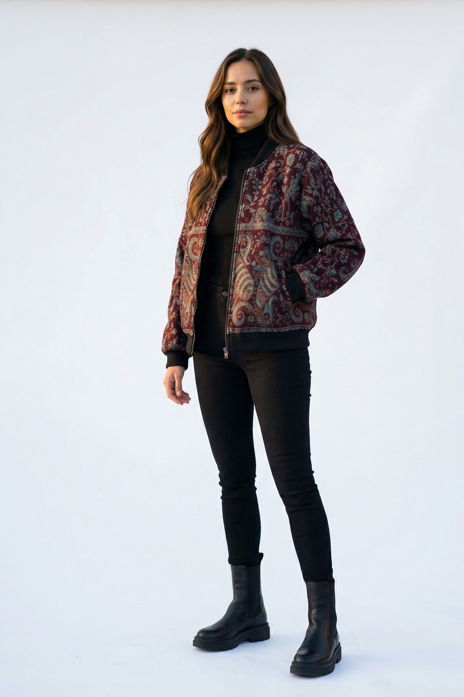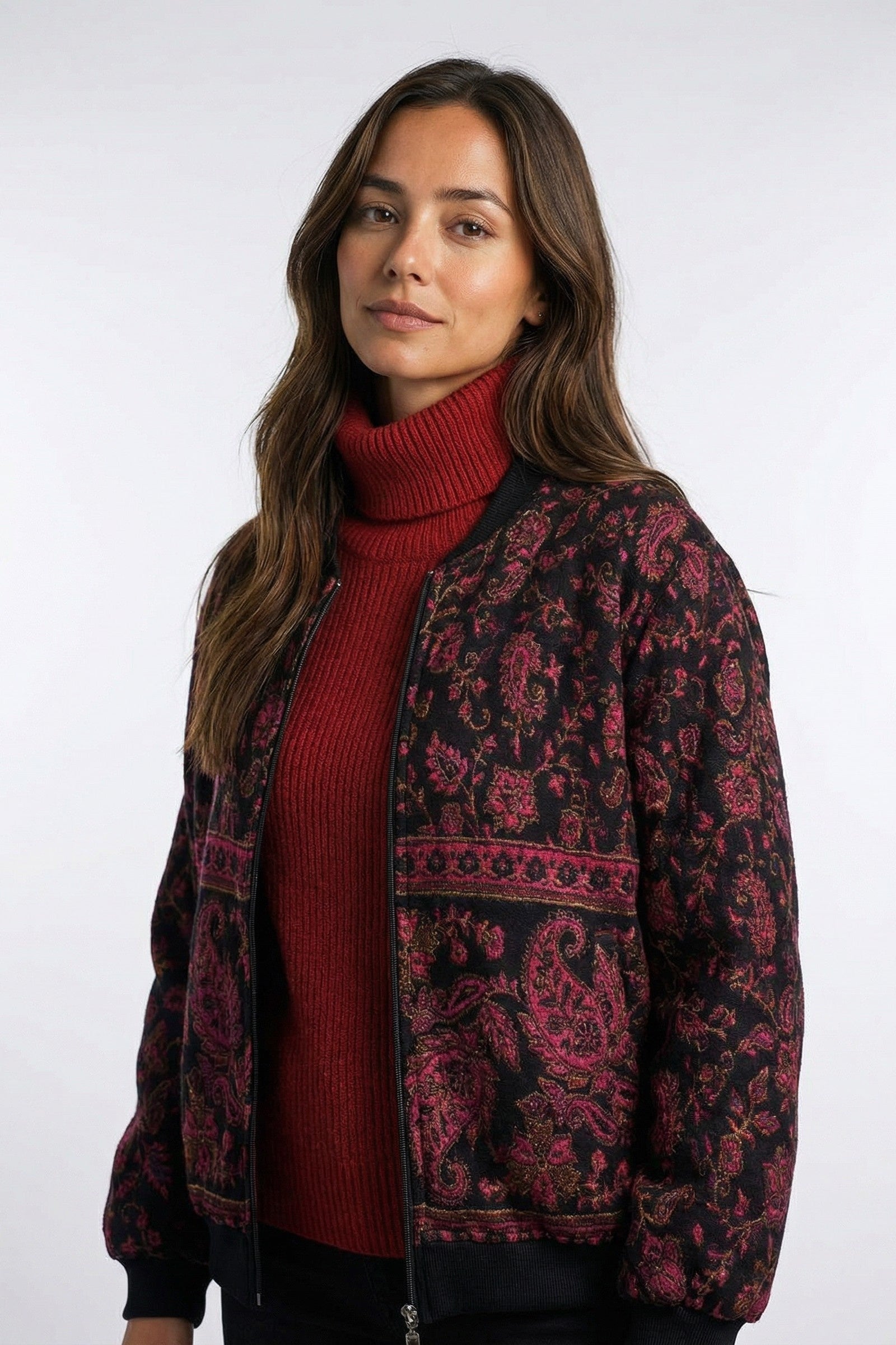Bomber unisex realizzato in tessuto esterno misto lana con motivo floreale ornamentale all-over ispirato ai tessuti tradizionali indiani. Progettato con una vestibilità leggermente ampia, comodo senza essere oversize o attillato. Stile taglia unica progettato per vestire dalla S alla L. Presenta uno scollo rotondo a coste, maniche lunghe, polsini a coste e un orlo continuo a coste nere che avvolge completamente la vita , una cerniera centrale anteriore e tasche anteriori. Rifinito con una morbida fodera in pile spazzolato nero per maggiore calore e comfort. Prodotto in India.