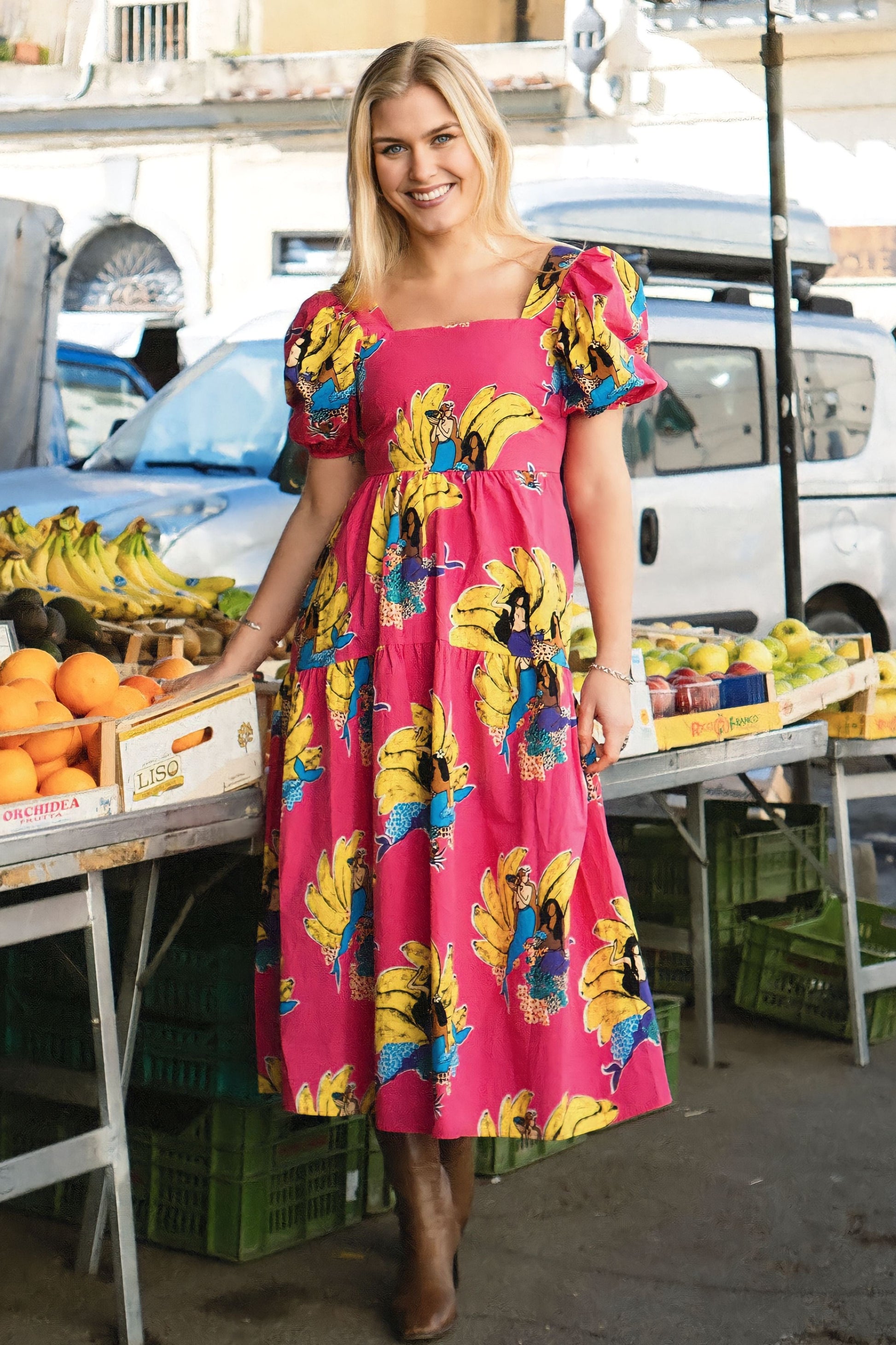 This midi dress features breathable 100% cotton fabric with a playful banana and mermaid print on vibrant fuchsia. Its puffed sleeves and below-the-knee cut provide a flattering, relaxed fit suitable for various occasions.