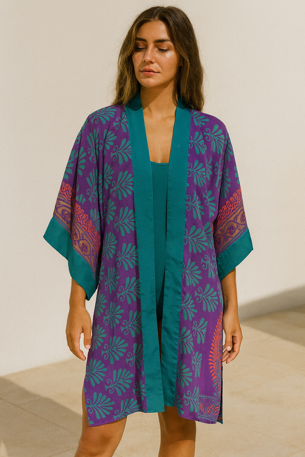 Combining the strengths of viscose and silk, this kimono offers luxurious and lightweight fabric, perfect for adding a touch of elegance to any outfit.