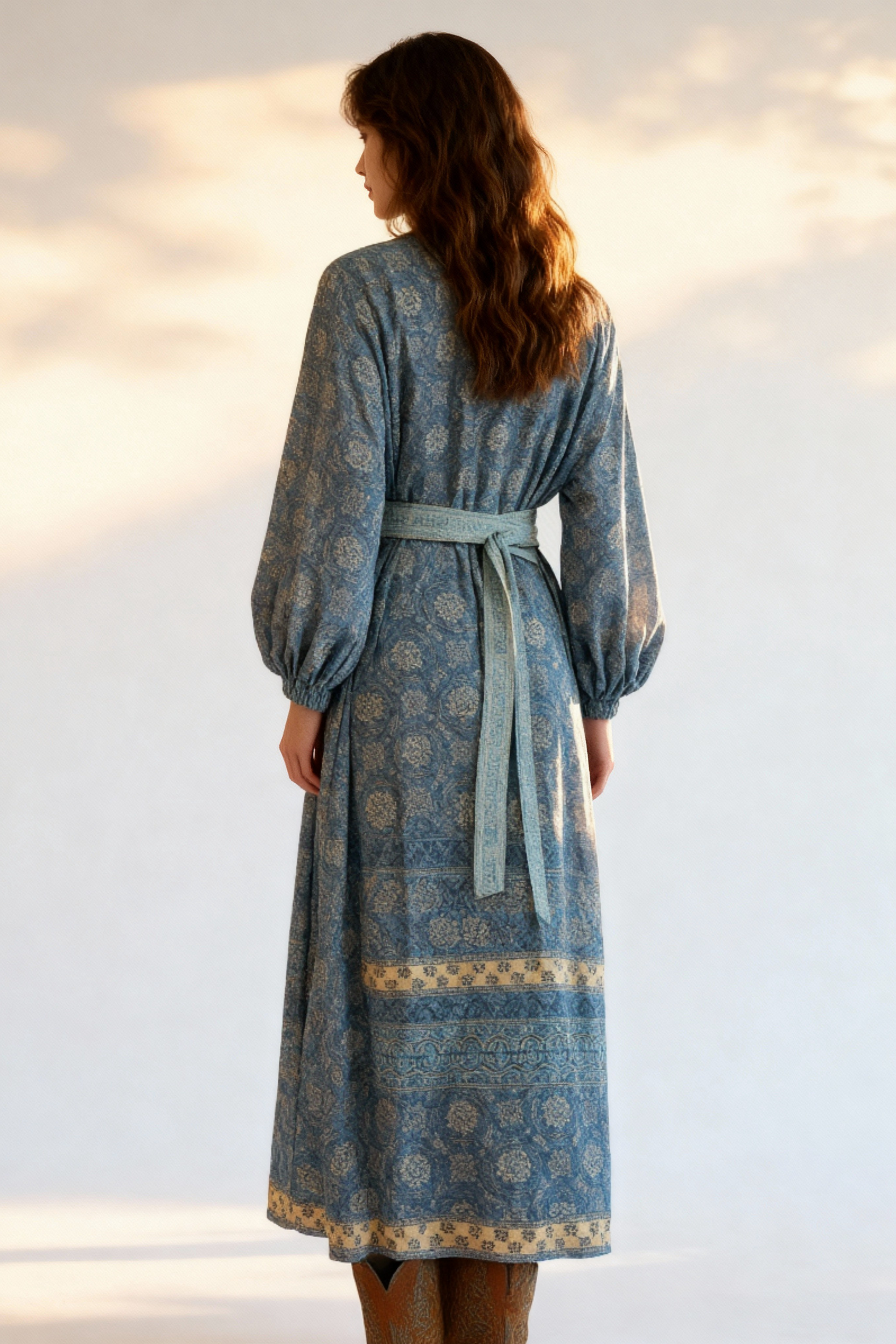 Handcrafted in India from a luxurious silk-viscose blend, this bohemian kimono dress combines elegance, comfort, and timeless style. Designed with long puffed sleeves and a flattering wrap silhouette, it drapes beautifully to just above the ankles, enhancing natural movement and grace. The delicate golden patterns add a touch of artistry and sophistication, making it perfect from day to night. Available in three radiant tones Jaipur Sun (yellow), Ganges Essence (blue), and Amber Bloom (rust) each dress evokes a unique spirit inspired by India’s colors and landscapes.