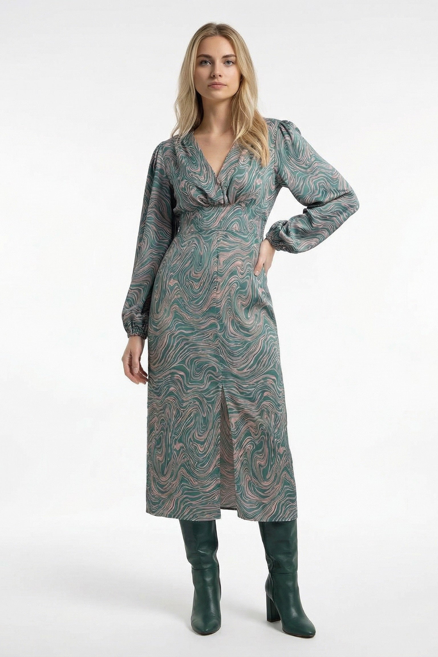 Elegant midi dress in pink and green shades crafted from luxurious polyester. Sultry V-neck silhouette and playful open leg design. Perfect for any social event, showcasing festive sophistication and ease of movement.