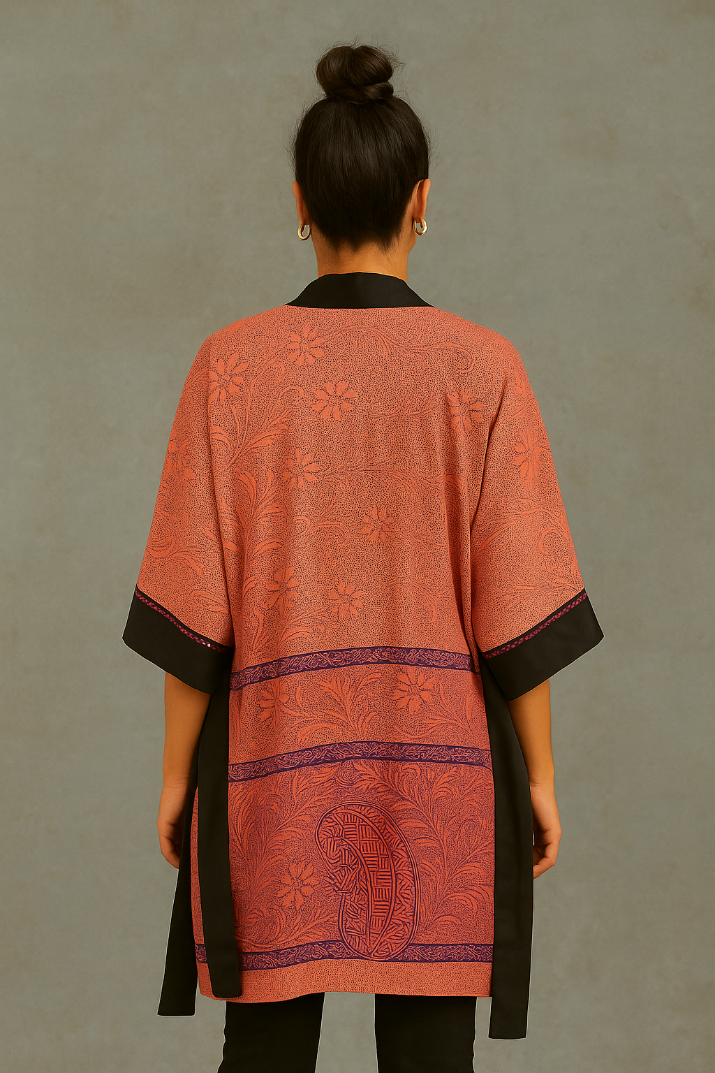 The Sakura Sunset Kimono is a refined boho-chic addition that enhances your wardrobe. It showcases a subtle coral floral pattern contrasted with striking black edging, combining elegance with a vibrant touch. Its airy fabric allows for easy layering over denim and boots for an urban look or as a stylish piece to lounge in at home.