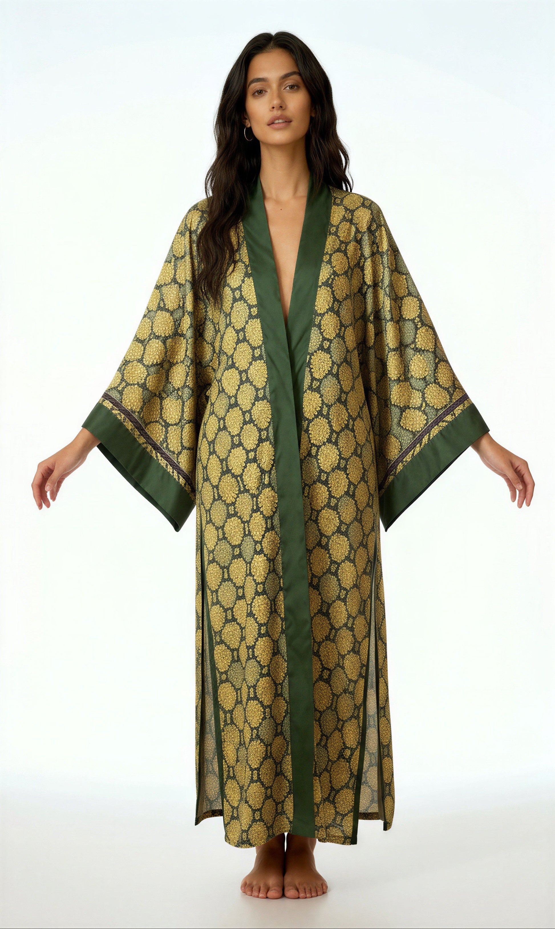 Handcrafted in India from a luxurious blend of silk and viscose, the Golden Lotus Kimono captures timeless elegance with a modern bohemian spirit. Its rich green base is adorned with intricate golden motifs inspired by nature, while the fluid silhouette drapes gracefully below the knees, featuring side slits for effortless movement. Perfect as a statement layer over simple outfits or as a chic lounge piece, this kimono embodies artistry, comfort, and versatility.